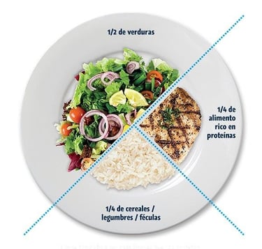 Un cuarto: carbohidratos de calidad (arroz, quinoa, patata, avena, pan integral).